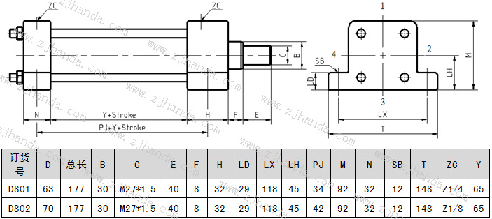 腳座安裝的低壓拉桿液壓缸的尺寸圖及參數(shù)